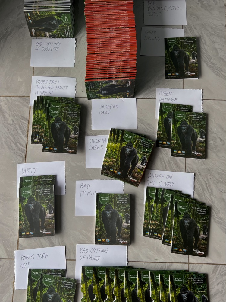 More than half of what we received from our Kampala printers had to be discarded. The cases meant to protect the Pocket Treasure arrived in disturbing condition: the laminate was peeling away. But the booklet pages themselves were far from blameless — countless defects kept our team busy for far too many hours, sorting the acceptable from the flawed.